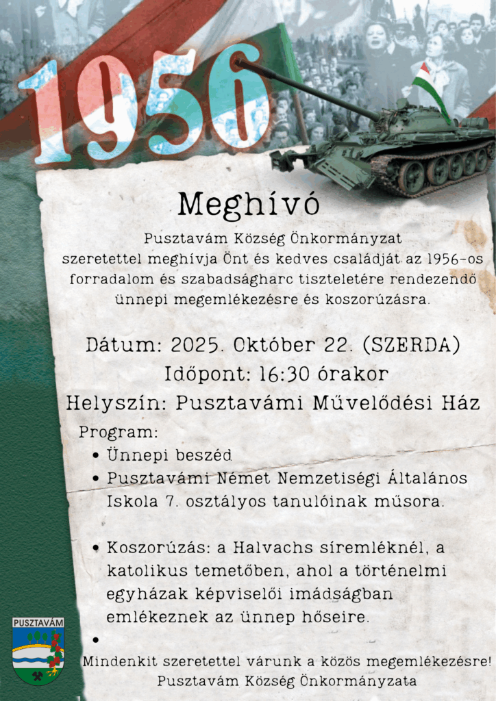 Pusztavám Község Önkormányzata szeretettel meghívja Önt és kedves családját az 1956-os forradalom és szabadságharc hőseire emlékező ünnepi rendezvényre és koszorúzásra.