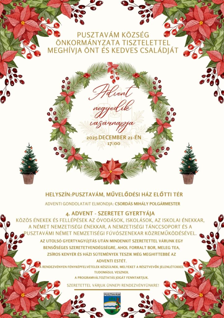 Pusztavám Község Önkormányzata szeretettel vár mindenkit a 4. adventi gyertyagyújtásra, a Szeretet gyertyájának ünnepére! 🕯️💖